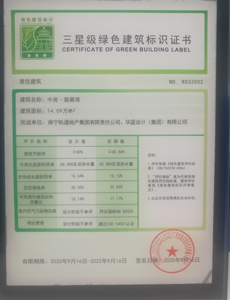 • 中房翡翠灣三星級綠色建筑標識證書