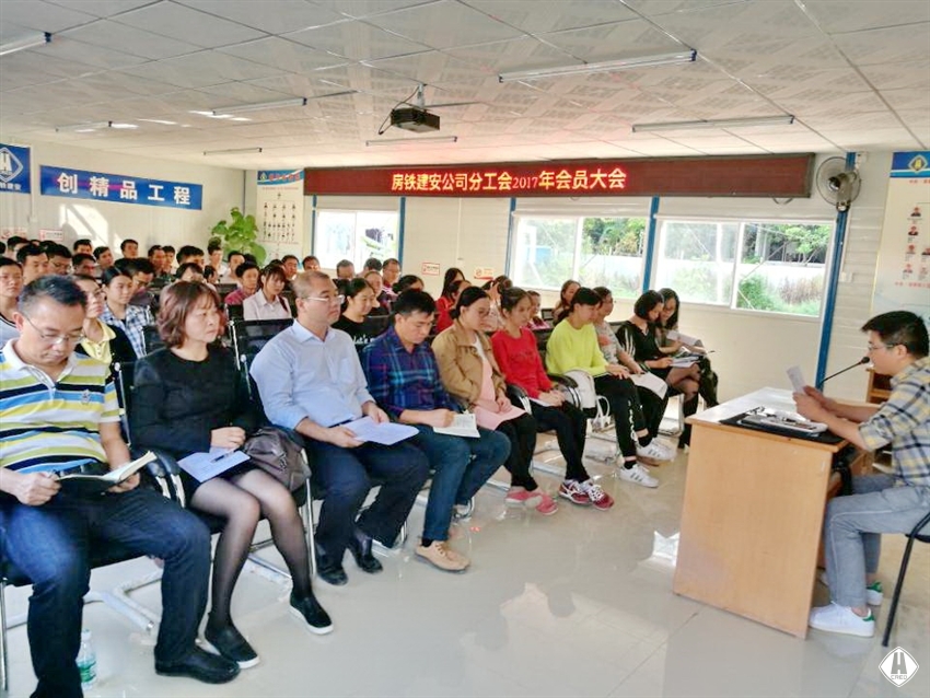 11月3日下午,房鐵建安公司在翡翠園B組團項目部會議室召開分工會2017年會員大會,大會由房鐵建安公司黨支部書記馬為孺主持,中房置業(yè)公司工會副主席李敏、房鐵建安公司領(lǐng)導班子成員以及分工會會員共78人參加大會。