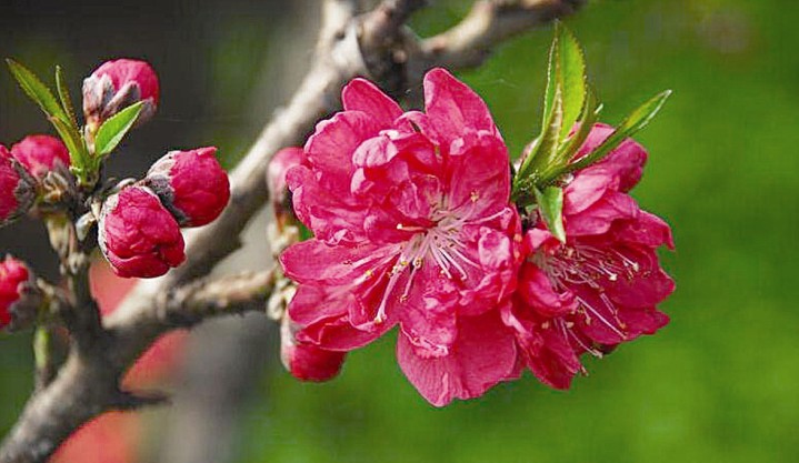 桃花,屬薔薇科,落葉小喬木,高可達6一8米。樹干灰褐色,粗糙有孔。小枝紅褐色或褐綠色,平滑。葉橢圓狀披針形,邊緣有細鋸齒?;▎紊?,有白、粉紅、紅等色,重瓣或半重瓣,花期3月。核果近球形,表面密被短絨毛,因品種不同,果熟6一9月。